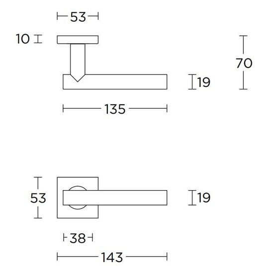Die Rosetten sind 53 x 53 mm groß und 10 mm dick. Die Griffe sind 135 mm lang. Weitere Maße finden Sie in der technischen Zeichnung.