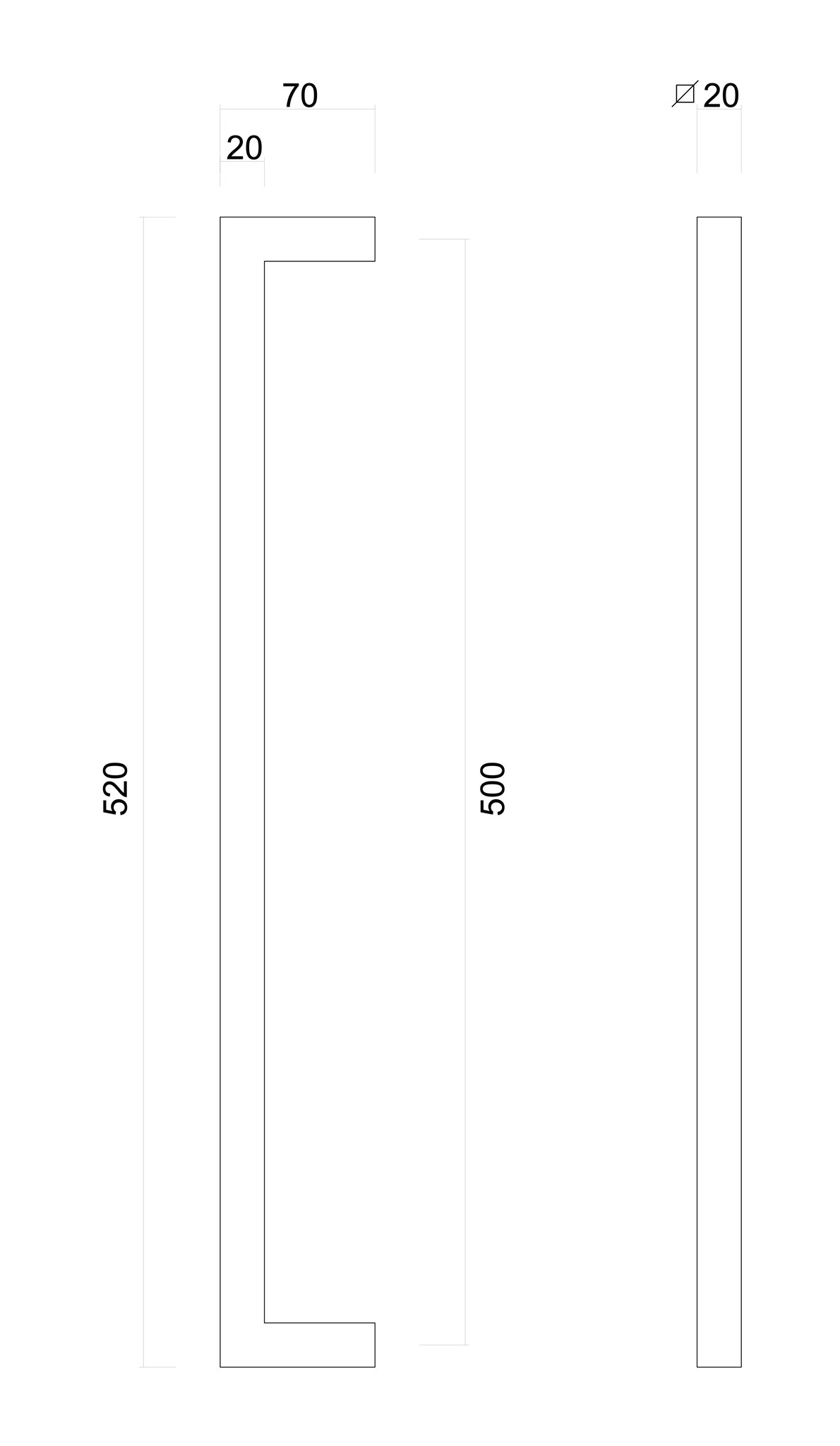 Schlanker Türgriff aus Edelstahl, am Ende gebürstet, um die eigene Edelstahloptik beizubehalten, sodass er mit quadratischen Füßen von 20 x 20 mm auch für den Außenbereich geeignet ist. Der Abstand zwischen den 2 Befestigungspunkten beträgt 500 mm.