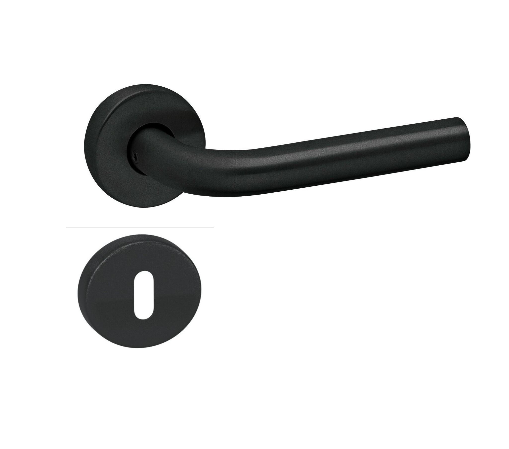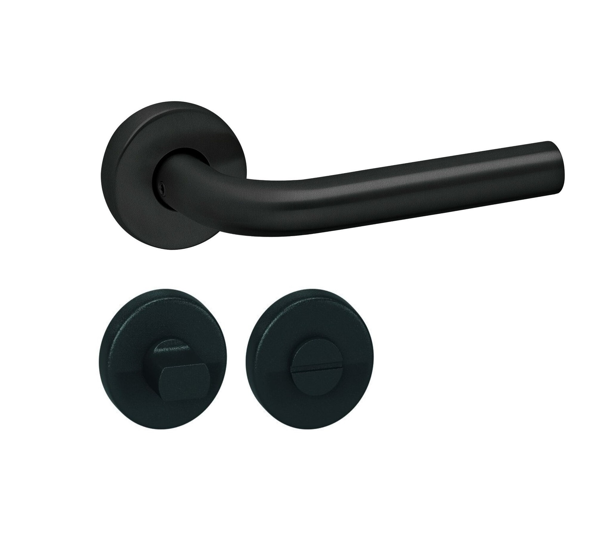 Schwarze LIDO-Türgriffe auf rundem Kunststoff unter Rosetten, geeignet für den Innenbereich