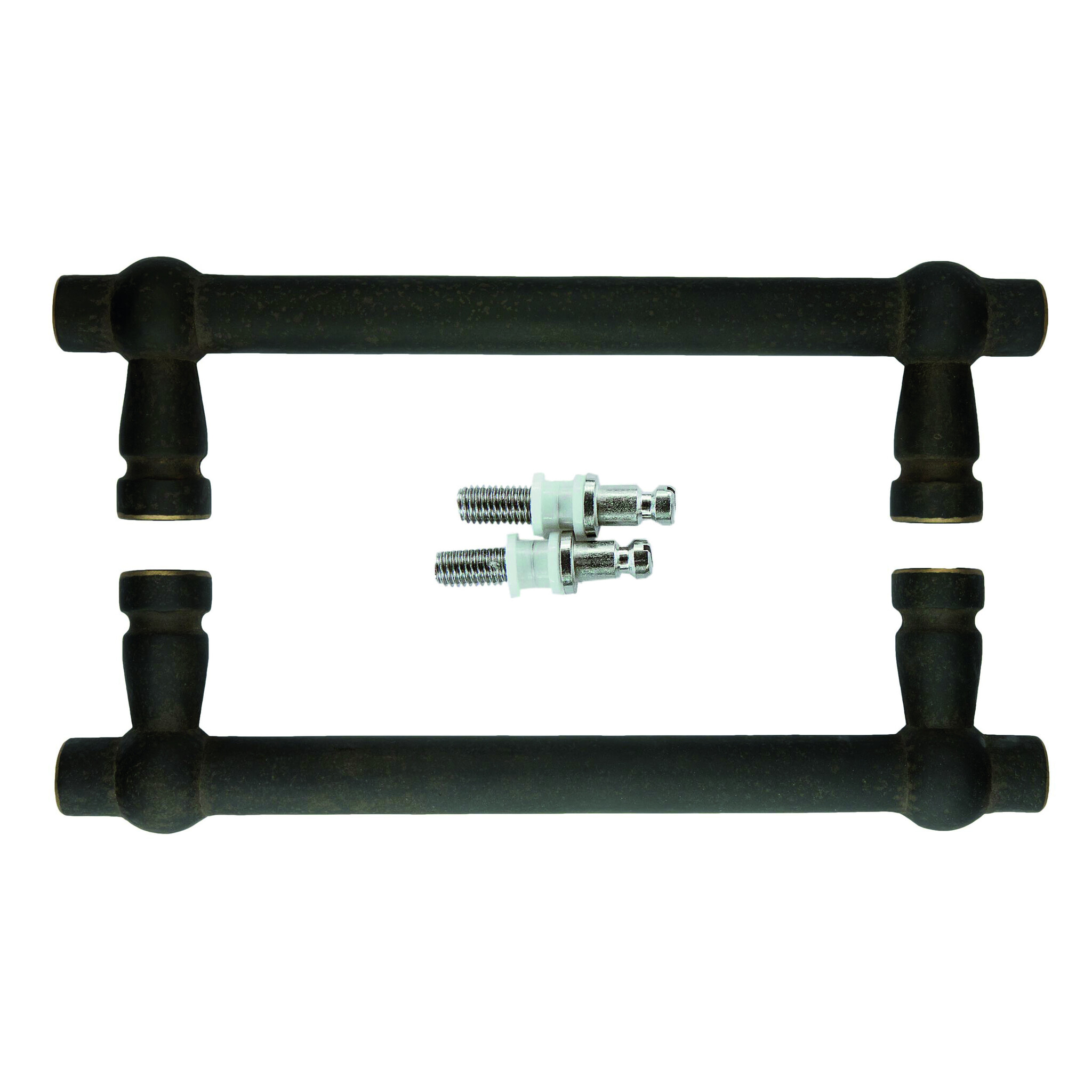 Die Türgriffe aus Altmessing werden paarweise inklusive des notwendigen Montagematerials für die durchgehende Montage an Glas-Innen- oder Außentüren geliefert.