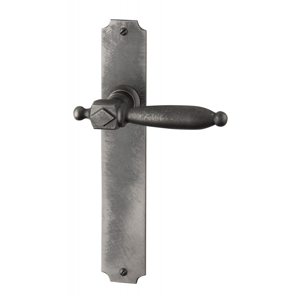 Exklusive Türgriffe auf einem rechteckigen Schild aus Rohstahl.