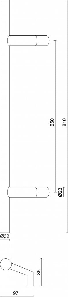 Der Durchmesser des Griffs beträgt 32 mm, sodass Sie einen festen Halt haben. Das Achsmaß beträgt 650 mm. Der Türgriff aus Edelstahl hat eine Gesamtlänge von 810 mm.