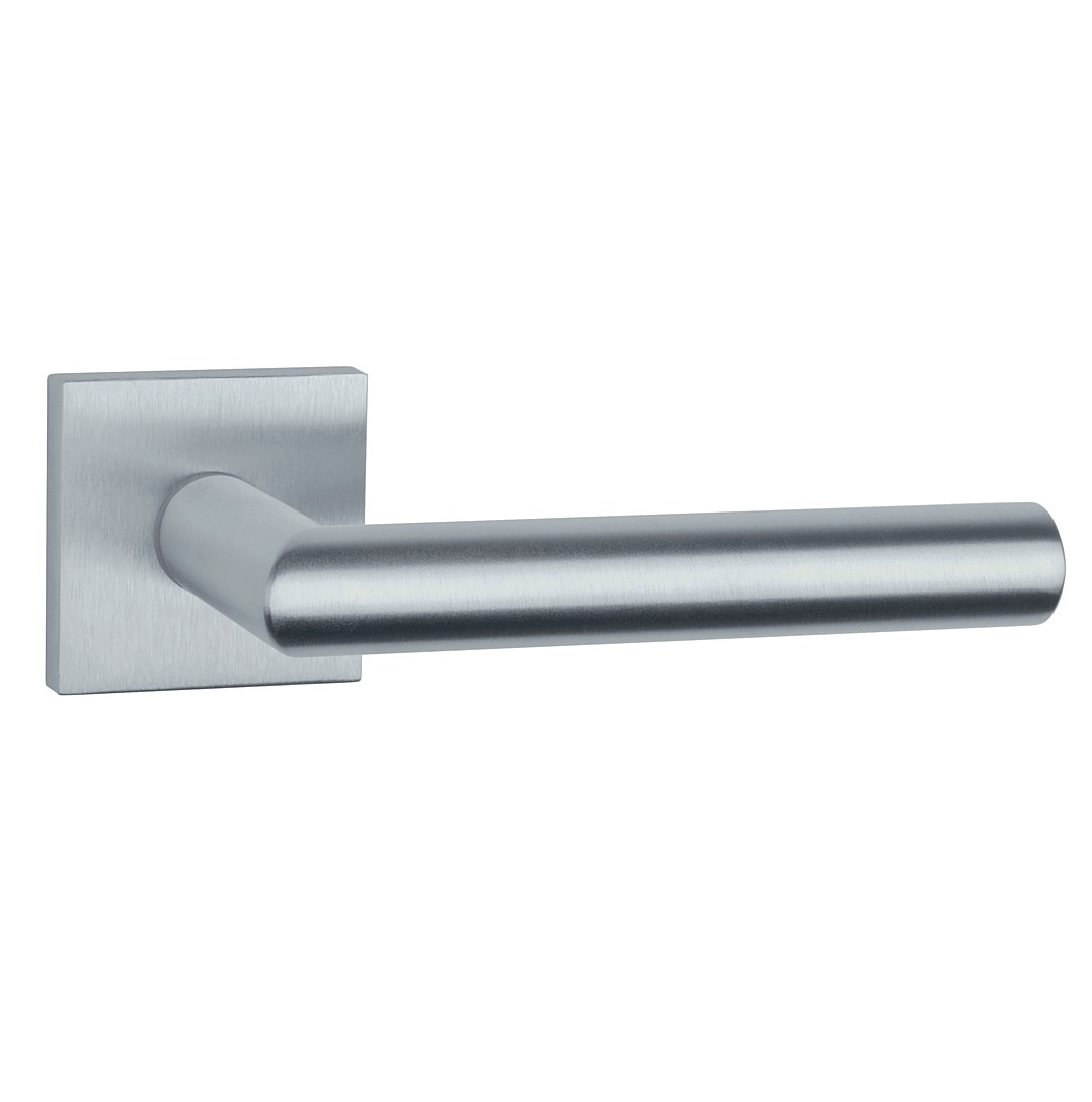 Diese massiven Türgriffe in Satin-Chrom sind auf quadratischen Rosetten mit den Maßen 53 x 53 mm montiert und nur 7 mm dick . Da die Rosetten aus einem Stück gefertigt und nur 7 mm dick sind, wirken diese Türgriffe elegant.