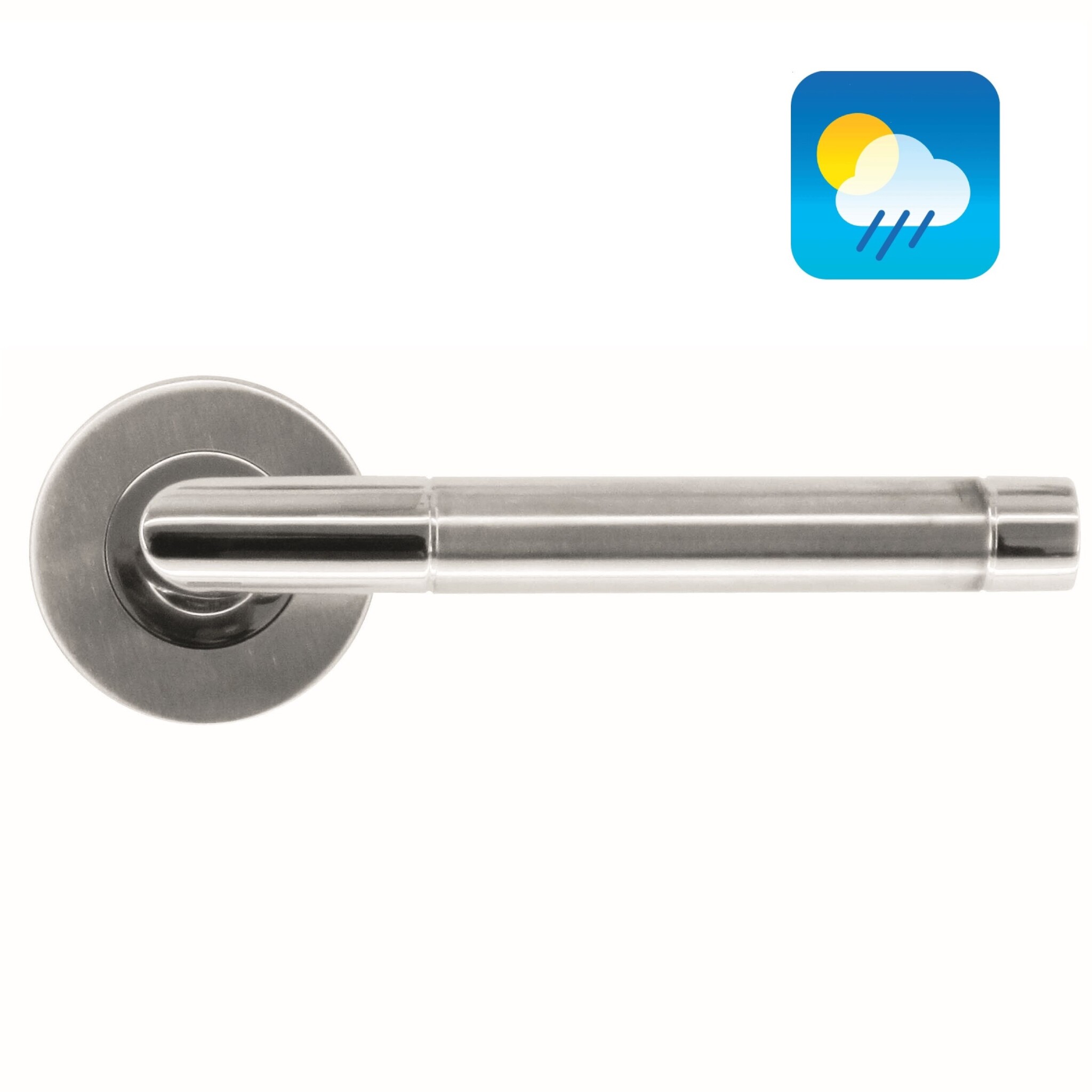Die Türdrücker sind gefedert, auf einer 53x8 mm Rundrosette montiert und verfügen über eine Unterrosette aus Kunststoff. Dadurch sind sie auch für den Außenbereich geeignet.