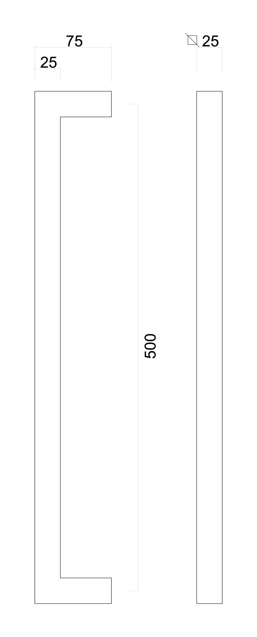 Schlanker Türgriff aus Edelstahl, am Ende gebürstet, um seine eigene Edelstahloptik beizubehalten, sodass er mit quadratischen Füßen von 25 x 25 mm auch für den Außenbereich geeignet ist. Der Abstand zwischen den 2 Befestigungspunkten beträgt 500 mm.