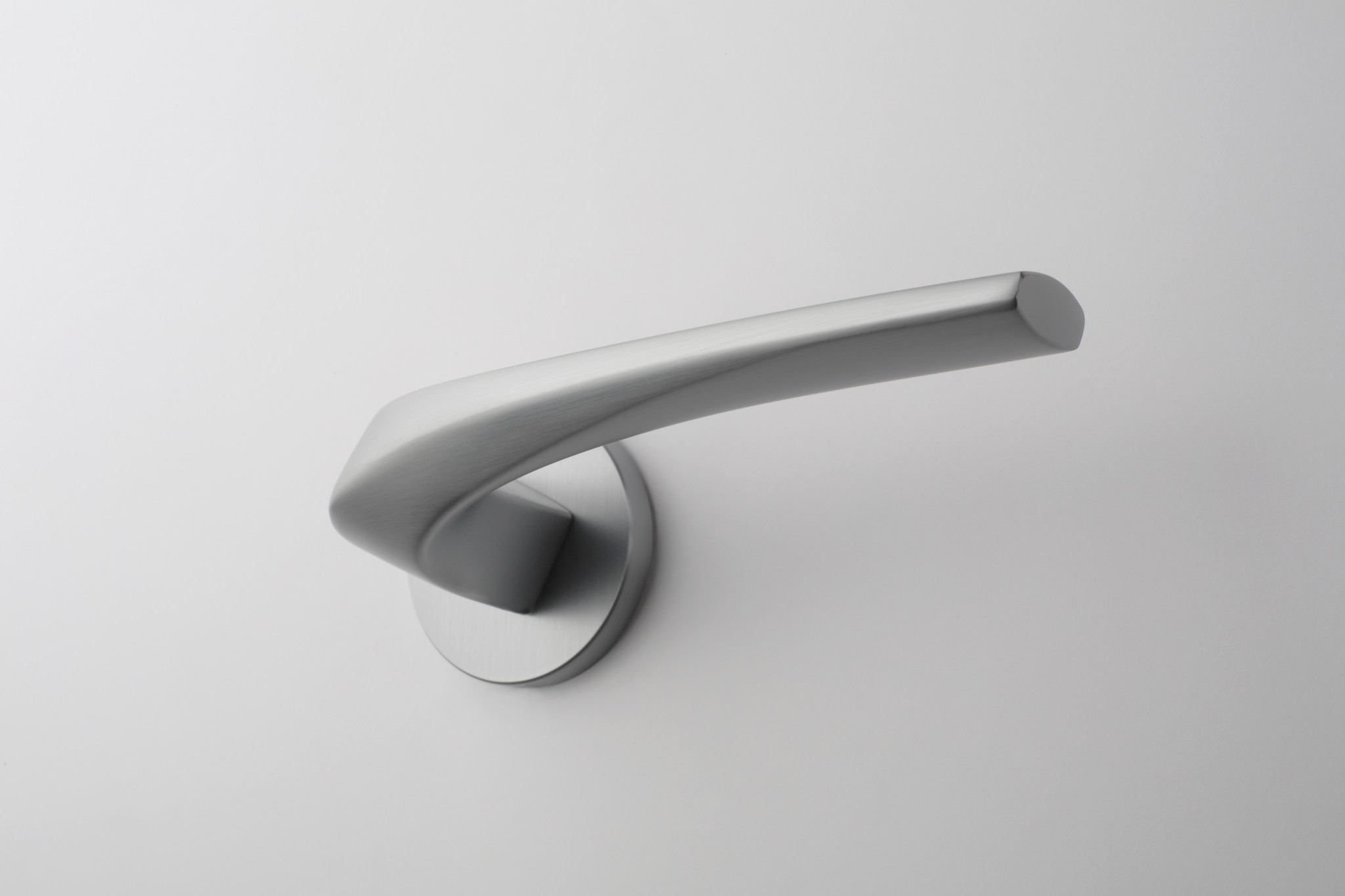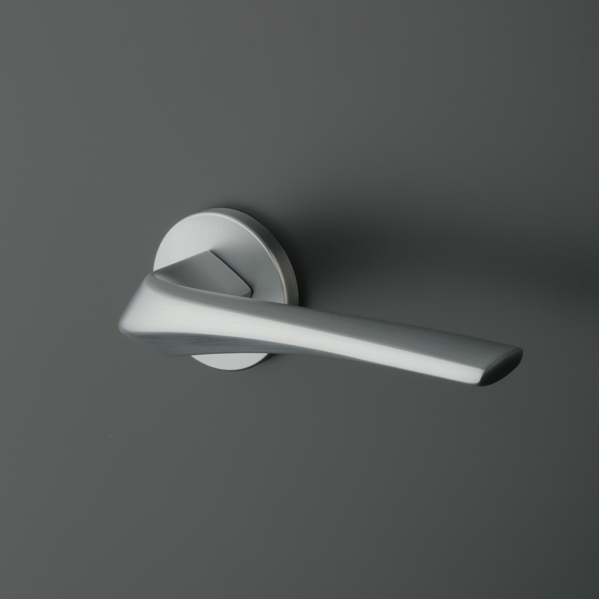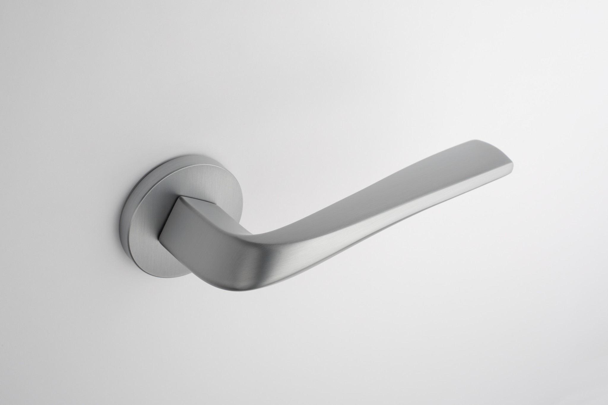 Beschreibung Massive Türgriffe Dalia in Chrom Satin auf runden Rosetten Ø52x7 mm von Aprile