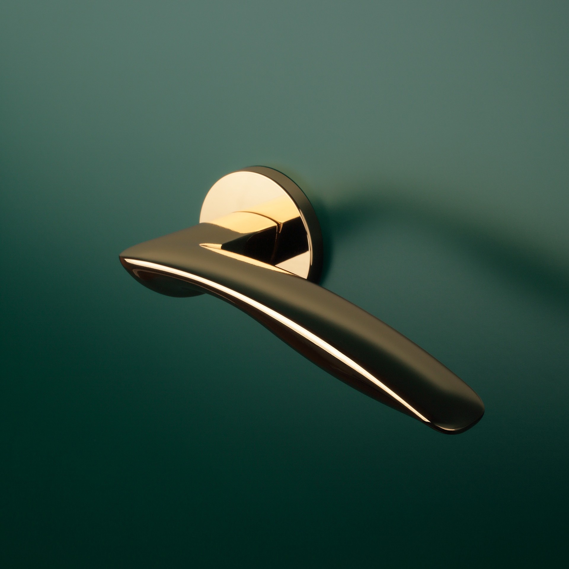 Diese massiven Design-Türgriffe in poliertem Gold haben einen leicht gebogenen Griff und sind auf runden Rosetten Ø 52 mm montiert. Der Griff ist zum Ende hin verdickt und bietet so eine perfekte Passform. Die Rosetten sind aus einem Stück gefertigt und nur 7 mm stark.