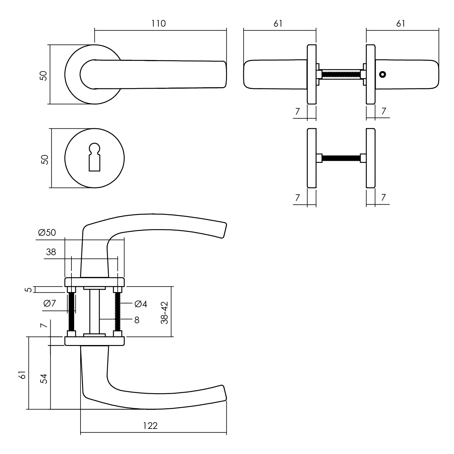 Der Türgriff steht auf einer runden Rosette von Ø 50mm und ist 7mm ausziehbar. Für einen besseren Halt ist diese Rosette mit ca. 7 mm breiten Laschen ausgestattet.