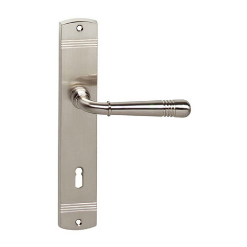 Der Türgriff „Helena“ auf einem matten Nickelschild ist auf einem Schild von 235 mm x 45 mm und einer Dicke von 8 mm gefertigt.