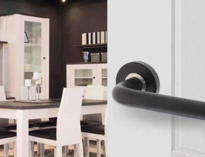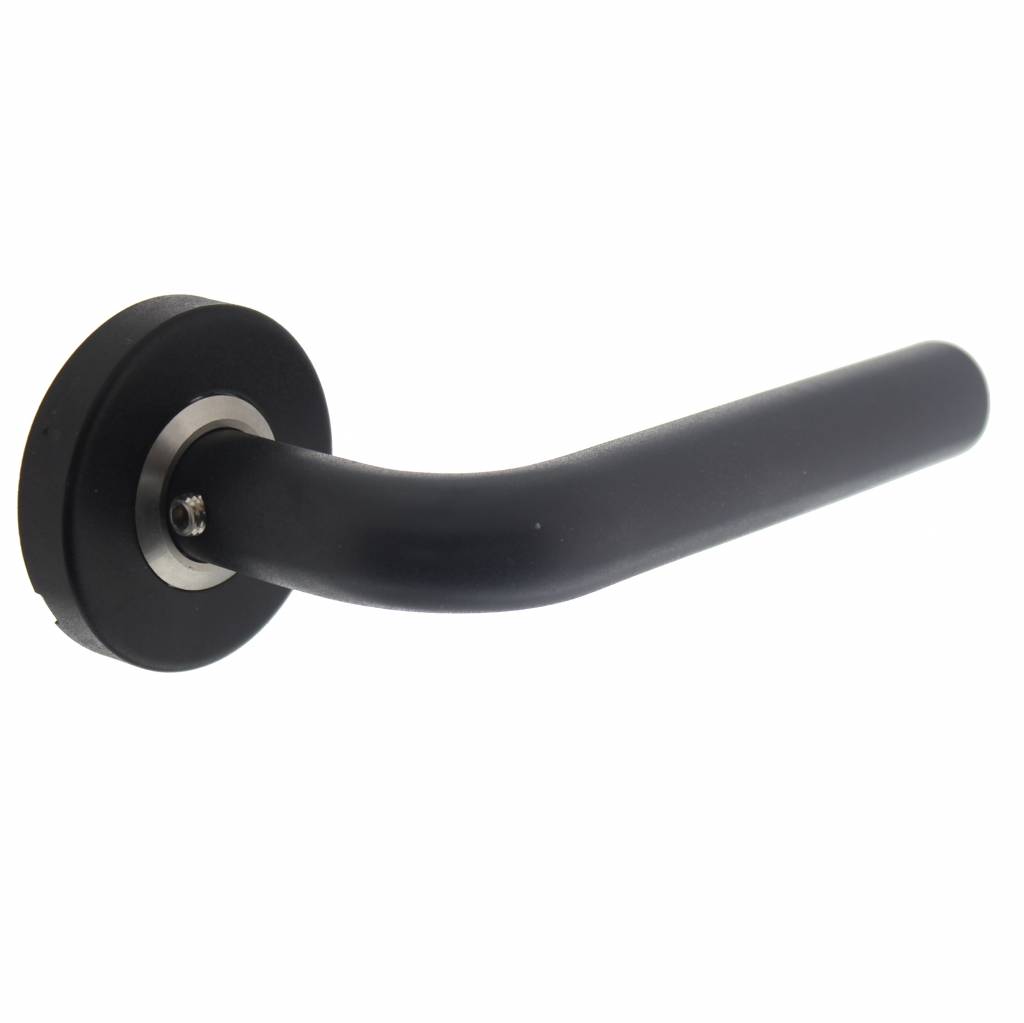 Diese schwarzen Luzerner Türgriffe haben eine geschwungene Ecke und sind auf einer runden Doppelfederrosette montiert.