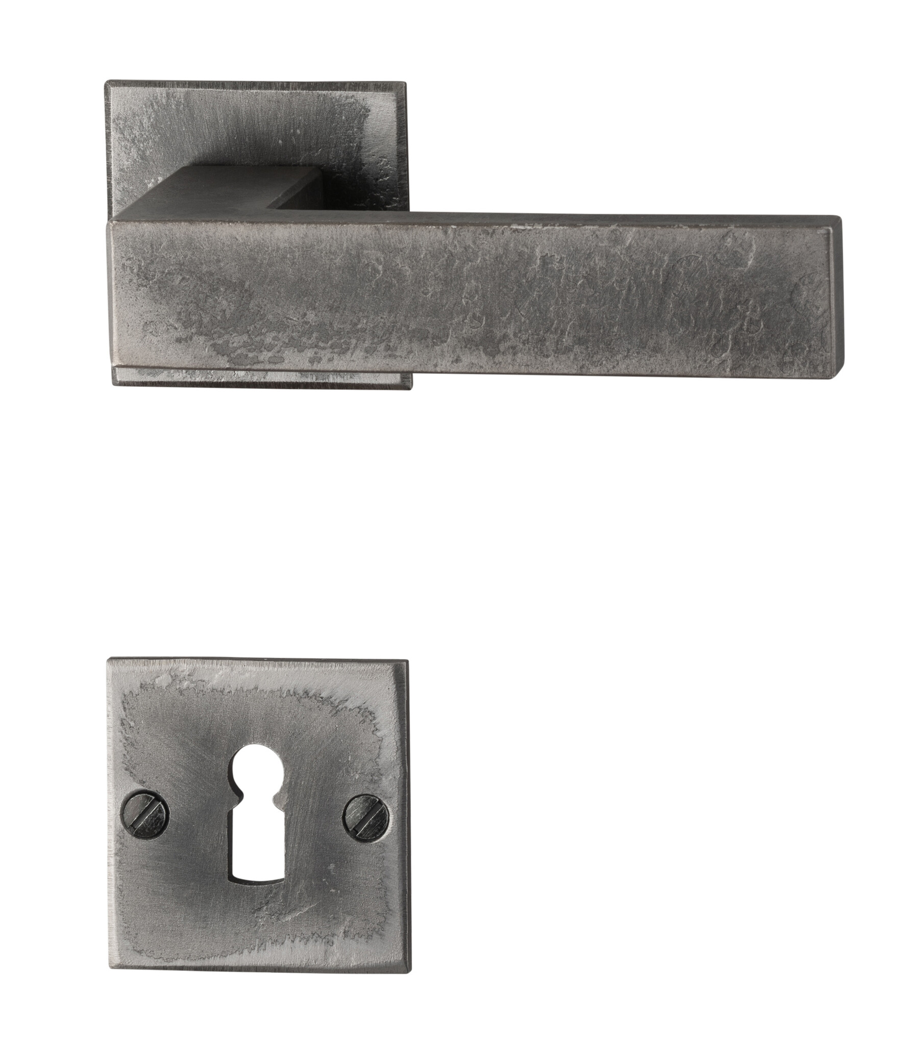 Exklusive Türdrücker auf eckigen, ungefederten Rosetten, die sichtbar in Rohstahl eingeschraubt sind.