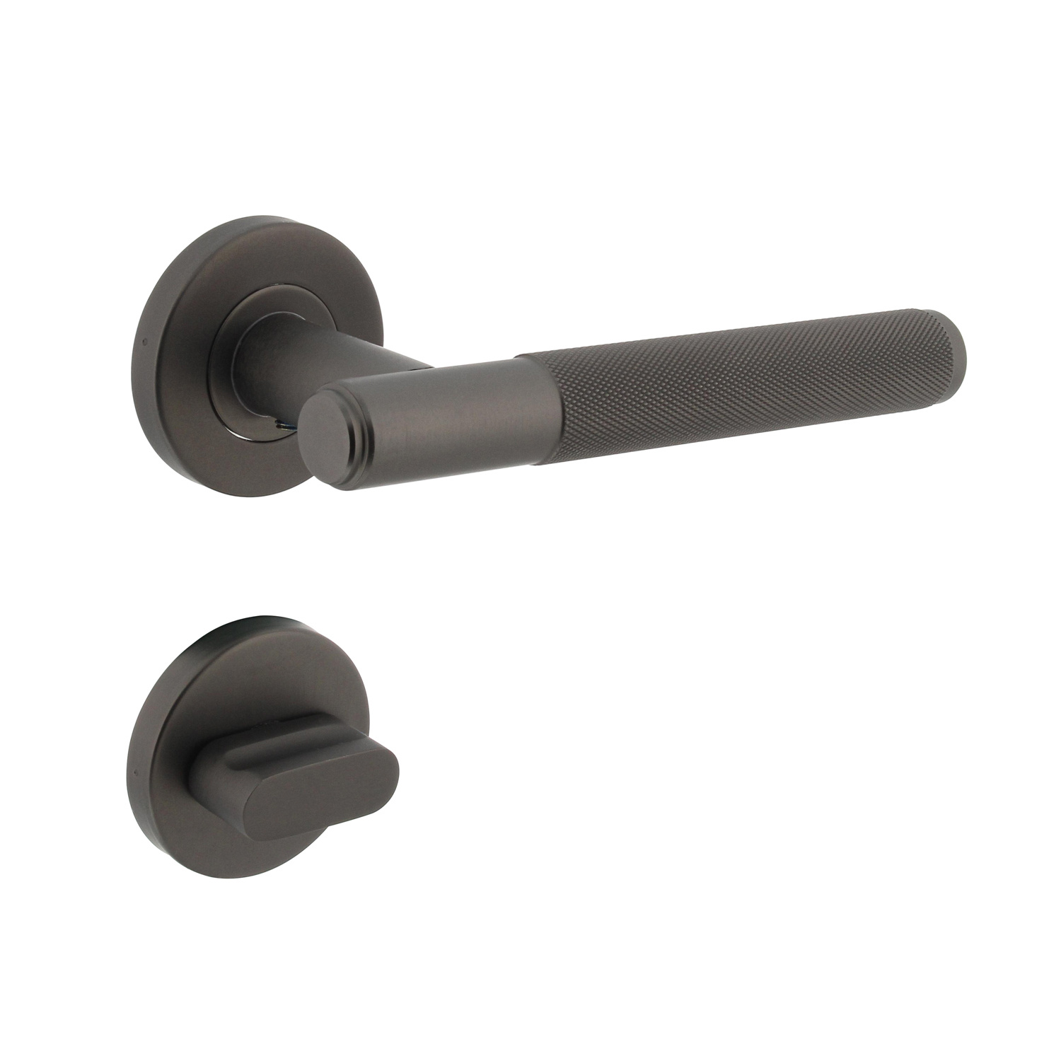 Die Intersteel-Türgriffe „Rombo“ bestehen aus Edelstahl und sind mit einer trendigen anthrazitgrauen Beschichtung versehen.