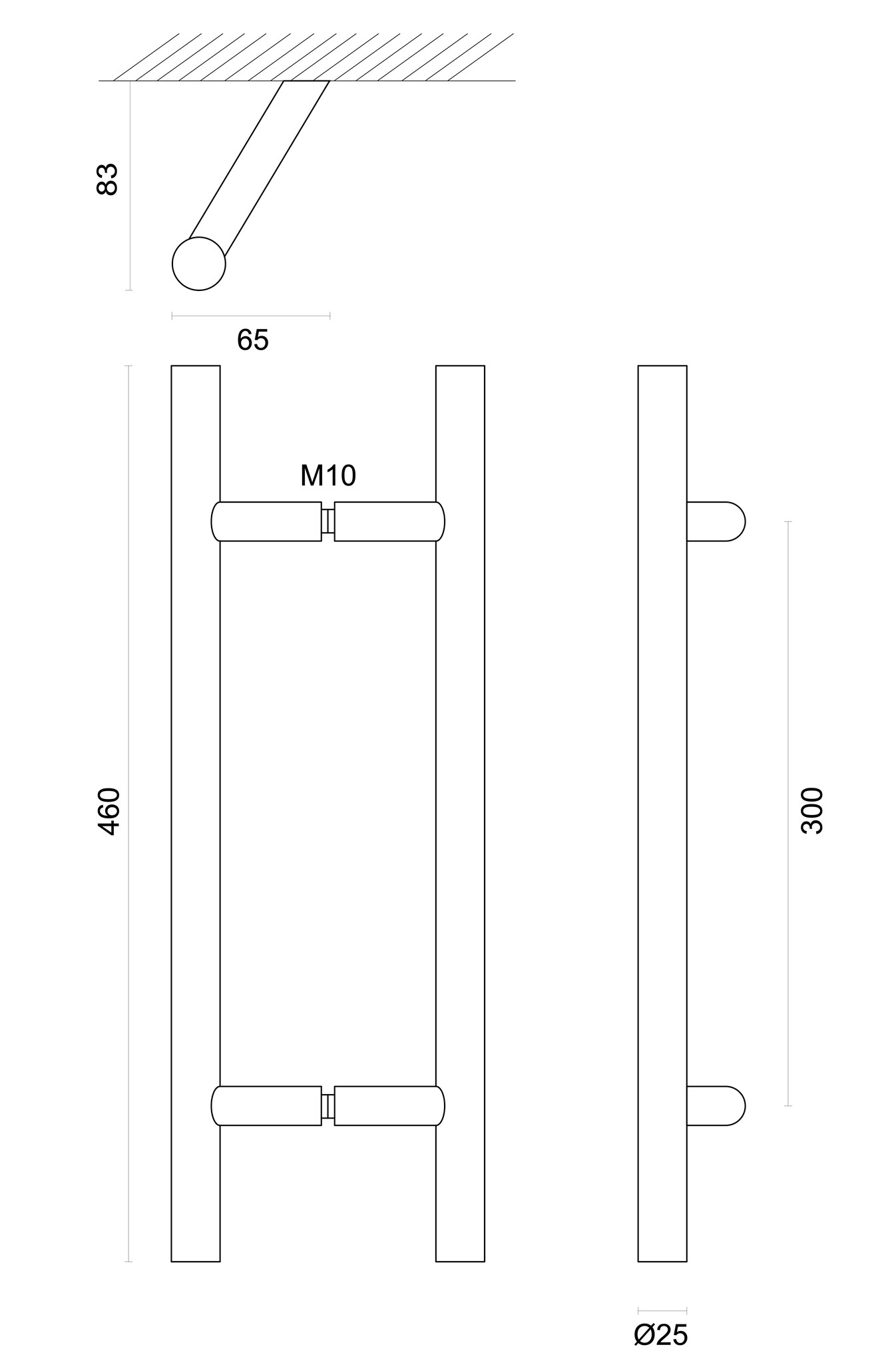 Schlanke Edelstahl-Türgriffe in T-Form im schrägen Winkel zur Montage an Glastüren mit einer Länge von 460 mm. Diese Edelstahl-Türgriffe haben einen Durchmesser von 25 mm und eine Achsgröße von 460 mm. Die Türgriffe stehen auf jeder Seite 78 mm vor.