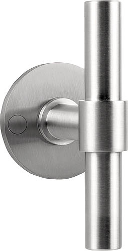 Diese Edelstahl-Türdrücker sind auf runden Federrosetten mit einem Durchmesser von 50 mm und einer Dicke von nur 5 mm montiert. Die Türgriffe sind auch in anderen Ausführungen erhältlich.