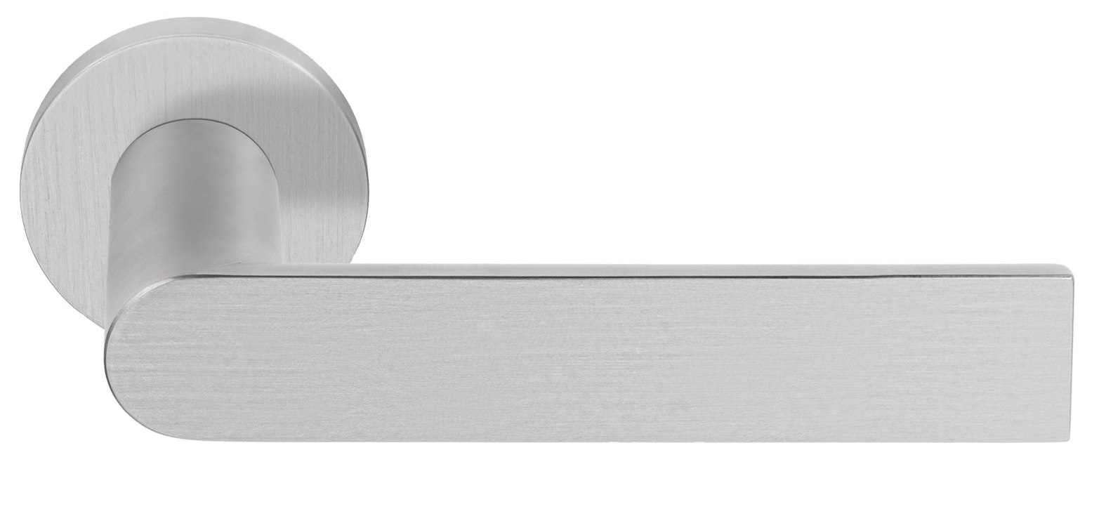 Diese Edelstahl-Türdrücker sind auf runden Federrosetten mit einem Durchmesser von 53 mm und einer Dicke von nur 6,5 mm montiert. Die Türgriffe sind auch in anderen Ausführungen erhältlich.