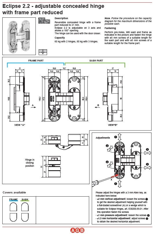 Das verdeckte Scharnier „Eclipse 2.2“ ist eine verbesserte Version des verdeckten Scharniers „Eclipse 2.0“. Die Tragfähigkeit wurde auf 30 kg pro Scharnier erhöht, die Einstellfunktionen für eine schnellere Montage optimiert und das Design mit eingelassenen Aluminium-Abdeckplatten abgerundet.