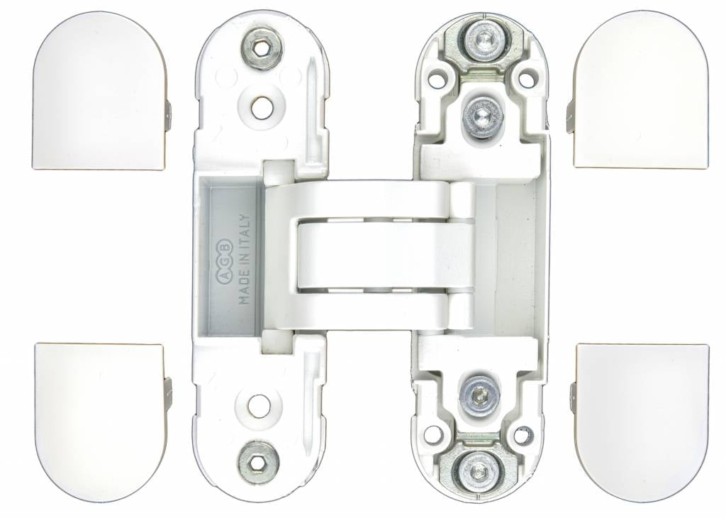 Diese weißen 3D-Scharniere sind um 180° drehbar und 3-fach verstellbar (Druck, vertikal und horizontal).