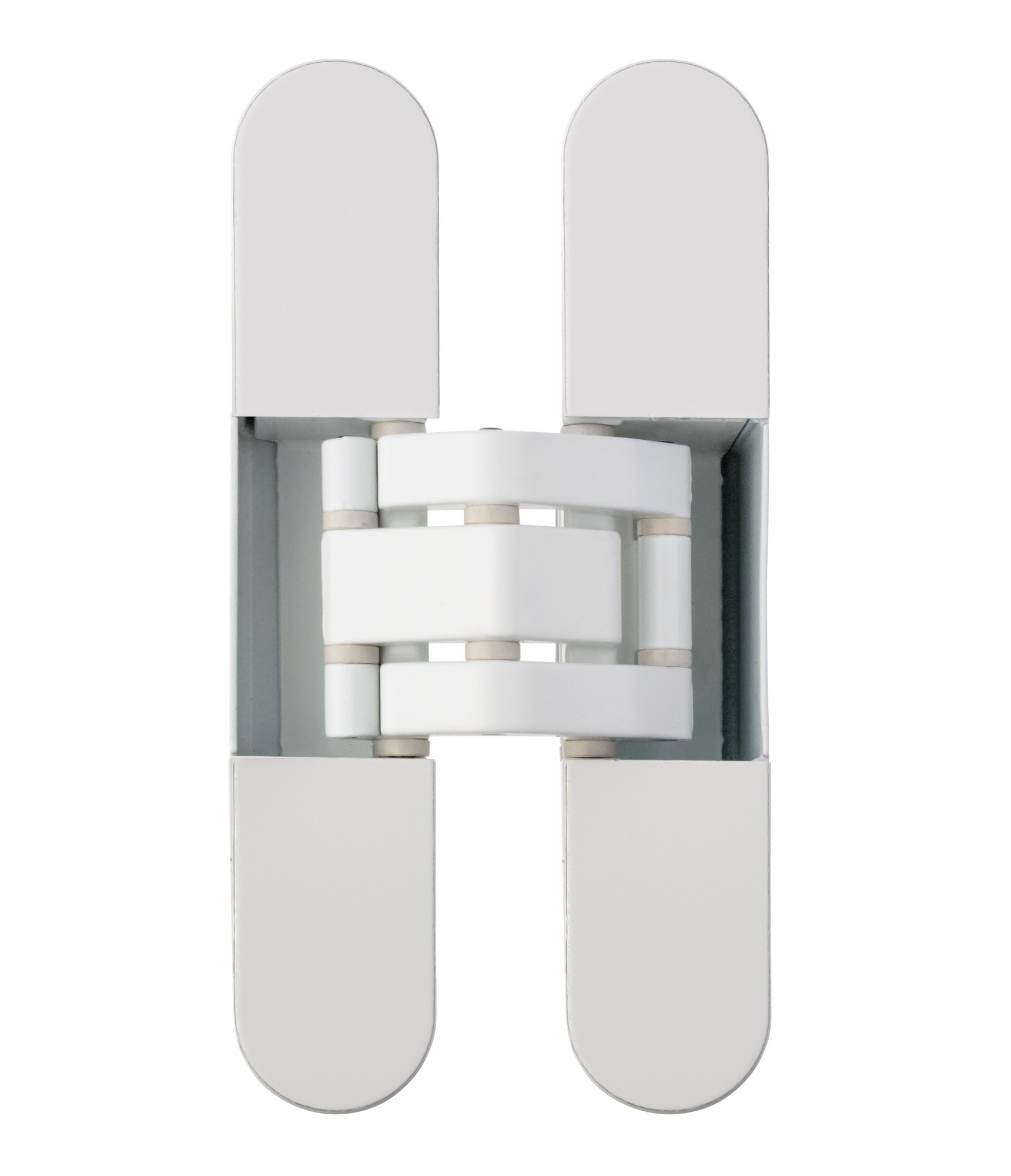 Diese weißen 3D-Scharniere stammen von der italienischen Firma Otlav, die seit Jahren für ihre Scharniere bekannt ist.
