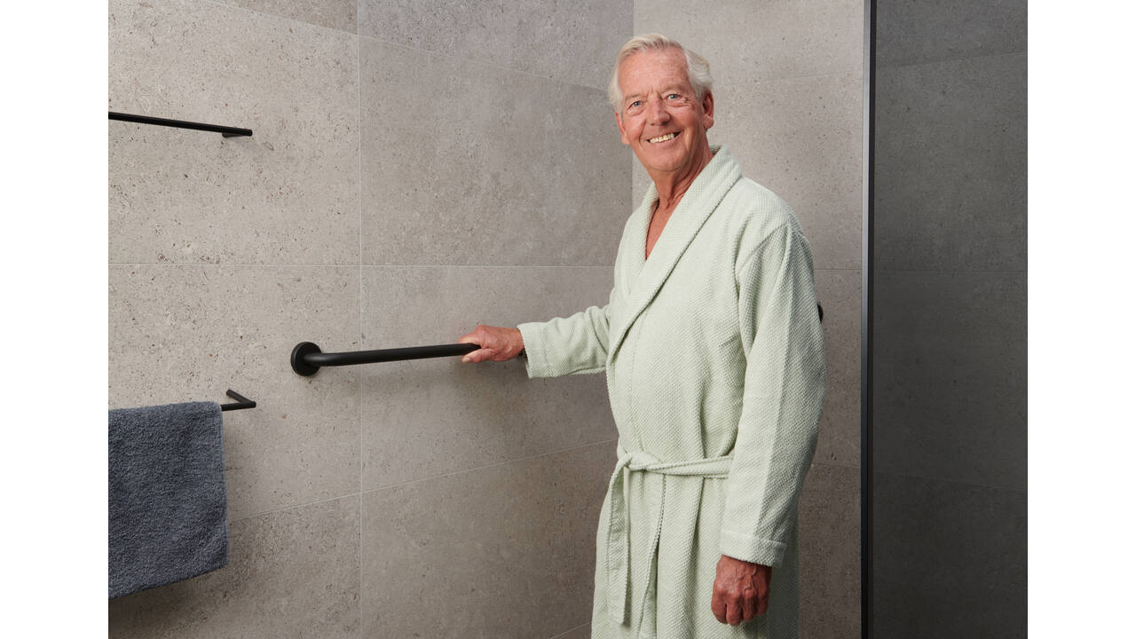 Das ergonomische Design sorgt für einen festen und bequemen Griff. Dank des cleveren drehbaren Befestigungsflansches können die Schrauben sowohl in der Wand als auch in der Fuge immer optimal positioniert werden. Der Flansch ist vollständig hinter einer Abdeckrosette verborgen, was der Wandhalterung ein sauberes und stilvolles Aussehen verleiht.
