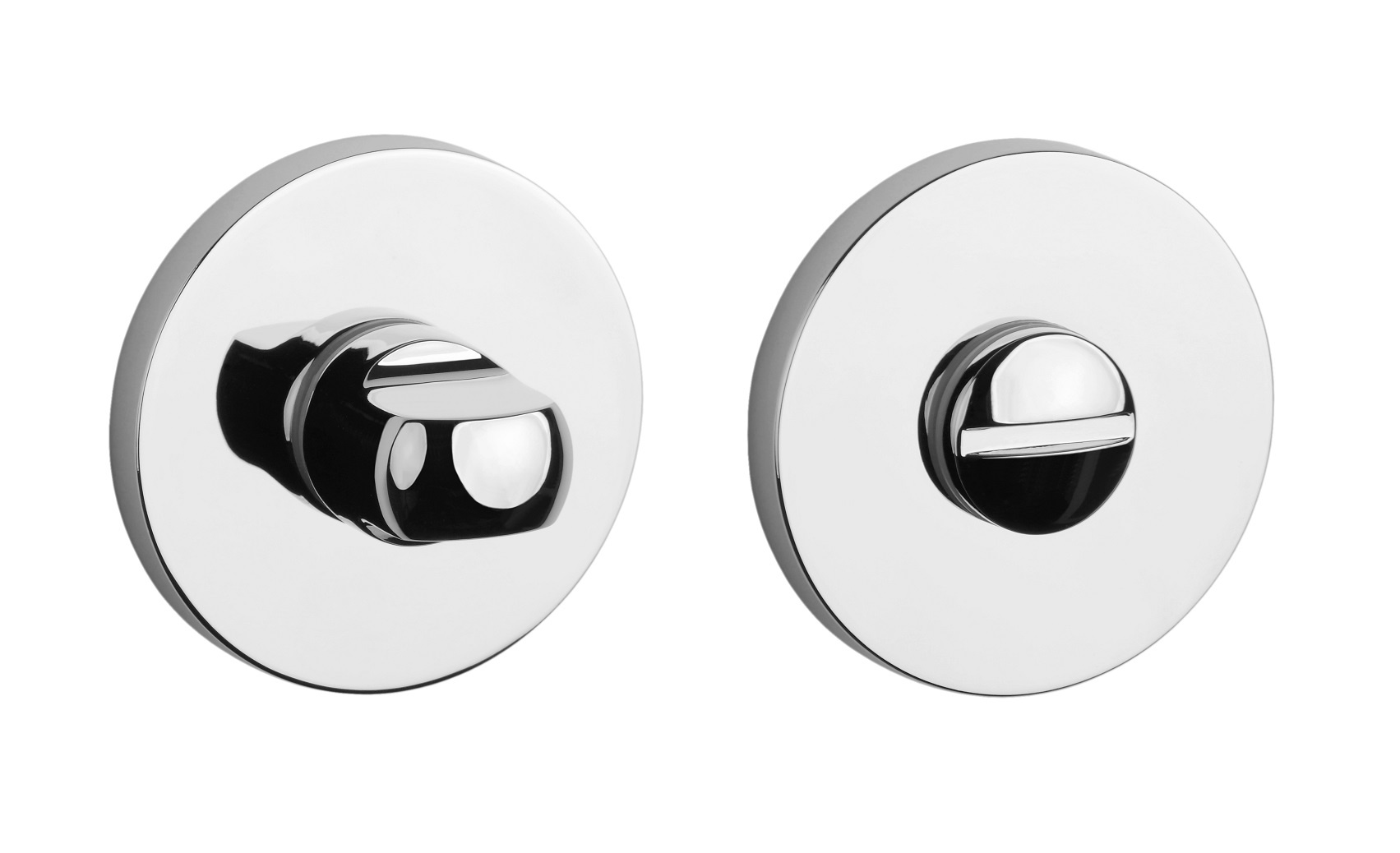 Diese chrompolierte WC-Garnitur verfügt über runde Rosetten mit Ø 53 mm und ist nur 7 mm dick, sodass sie an den Türen ästhetisch ansprechend aussieht.