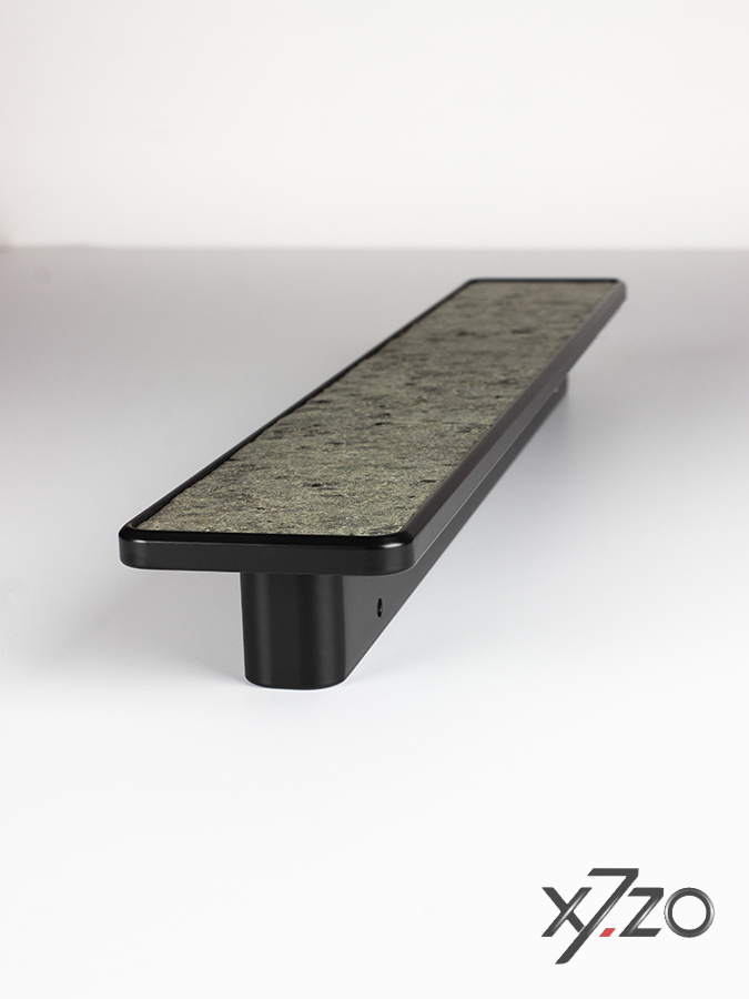 Dieser schöne rechteckige Türgriff, entworfen und hergestellt in Europa, kombiniert eine stabile Aluminiumbasis mit einer edlen Steinfurnieroberfläche in einem warmen, glänzenden Silberton.