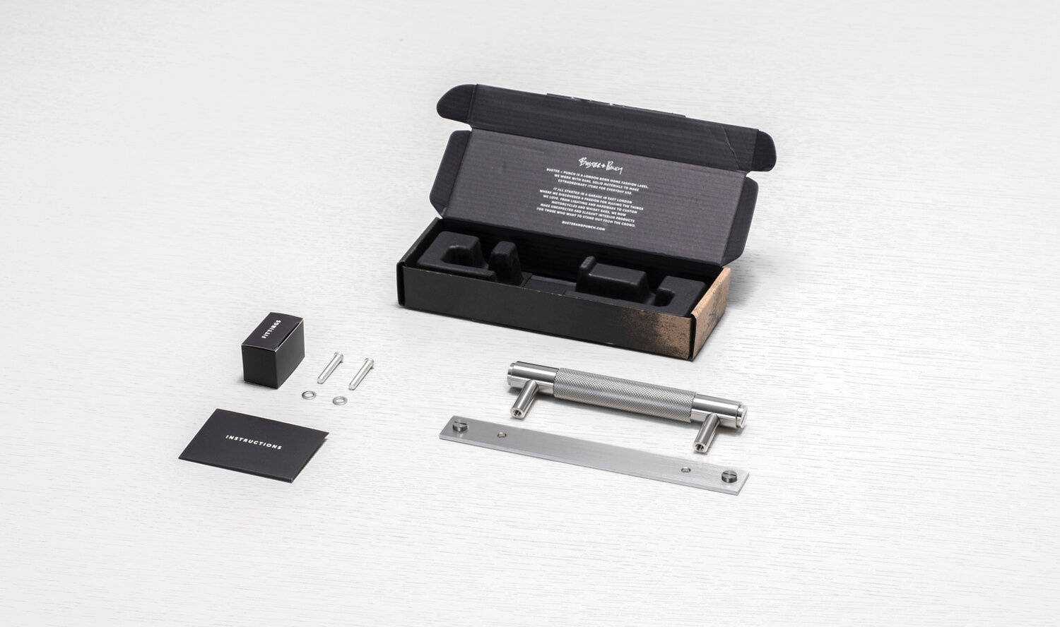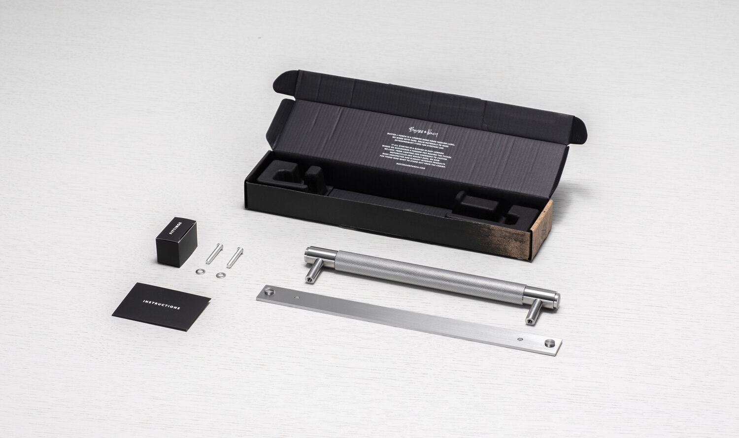 Massiver Möbelgriff aus Edelstahl auf Platte von Buster+Punch.