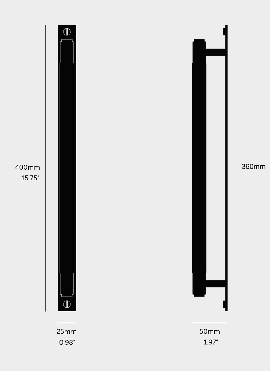 Die schwarze Zugstange hat eine rechteckige Rückplatte aus massivem schwarz eloxiertem Metall und ist mit schwarzen Metallmünzenschrauben versehen.