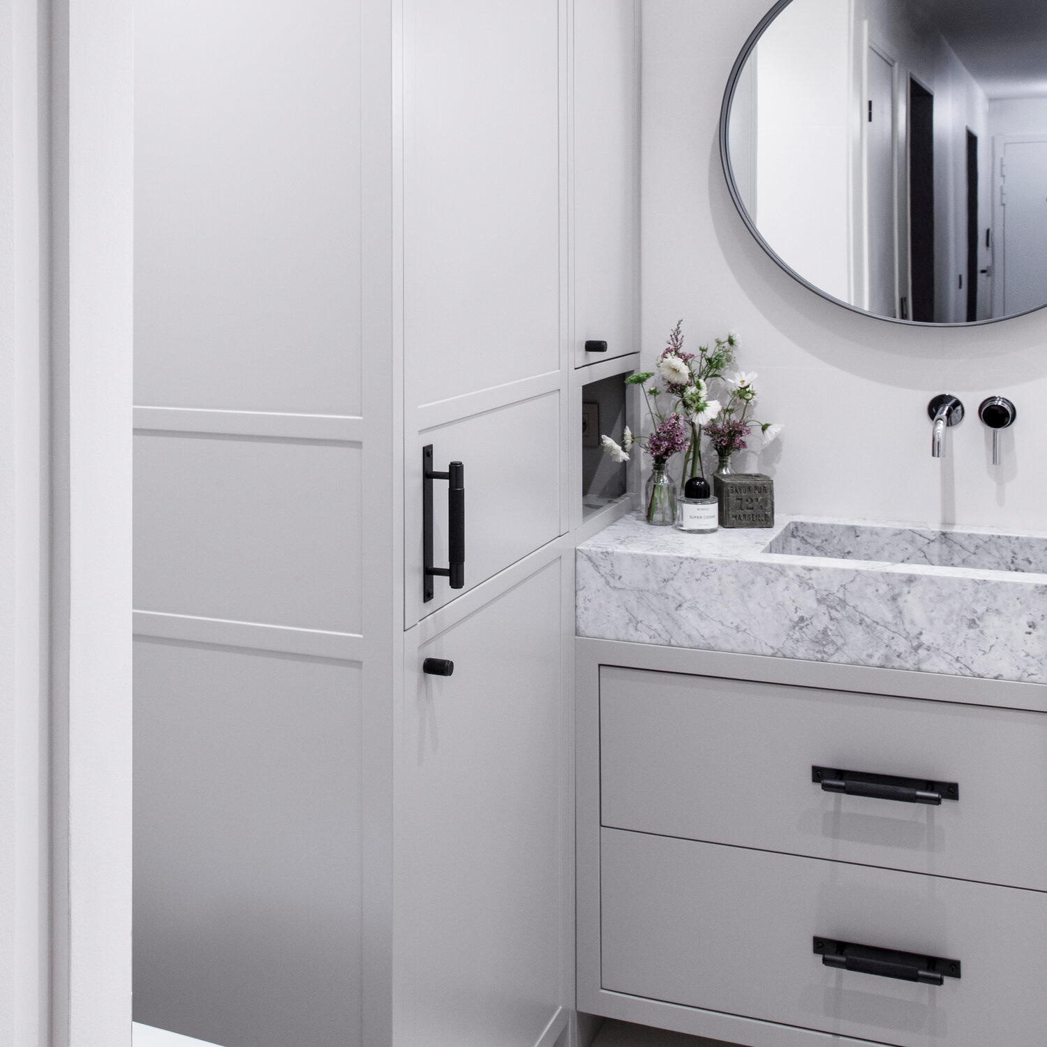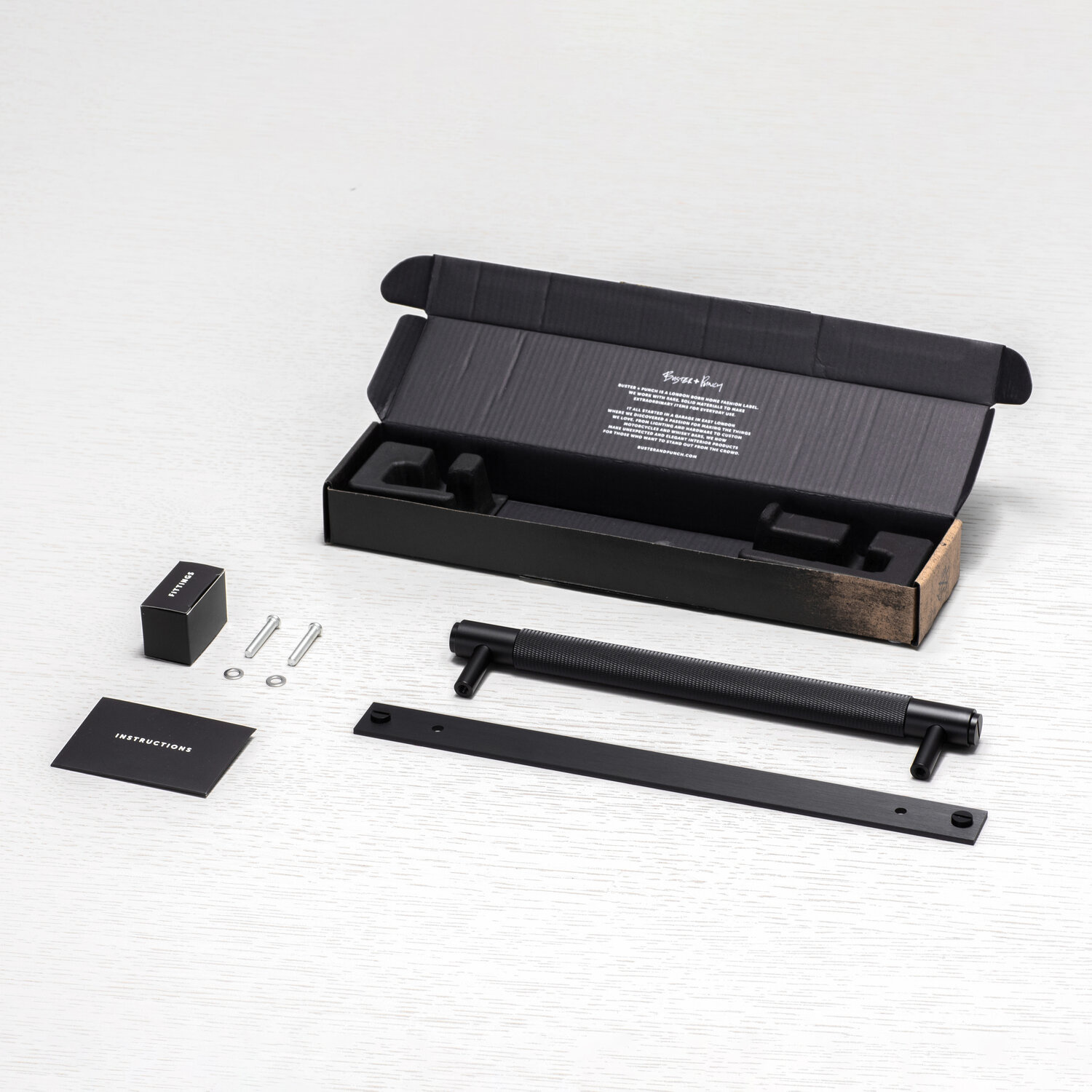 Schwarzer Möbelgriff auf Platte Buster+Punch