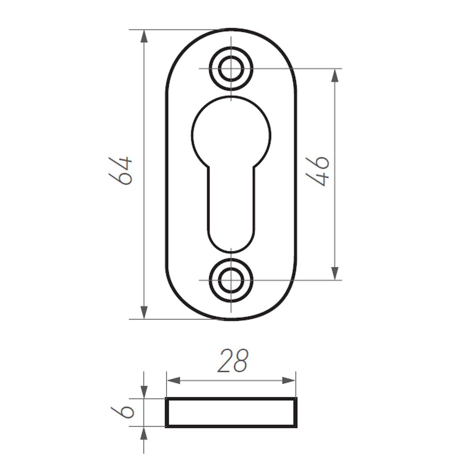 This article concerns a plate with cylinder hole opening and has an oval shape with the following dimensions: 65 x 28mm. The cylinder plate for interior doors is supplied PER PIECE including mounting materials.