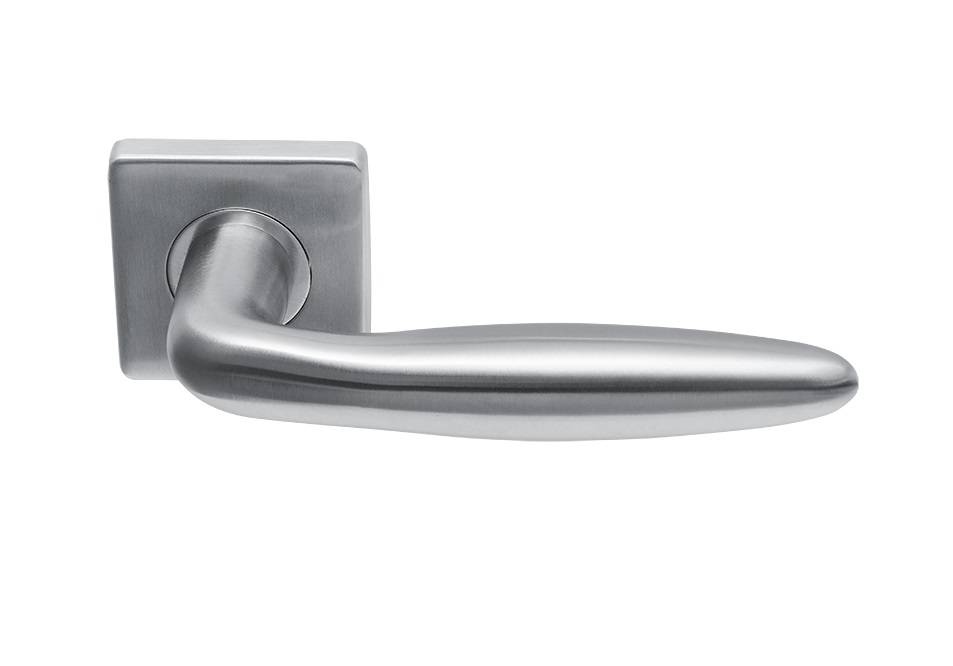 These solid stainless steel door handles are spring-loaded and stand on 53 mm square rosettes.