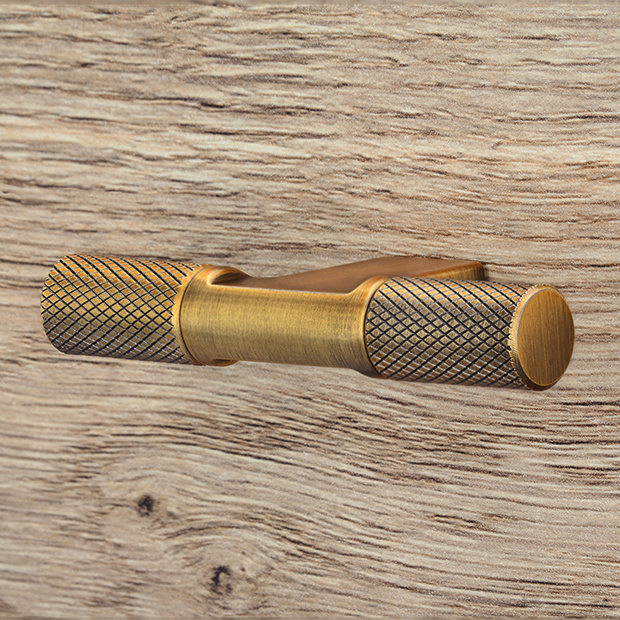72mm T-shaped furniture knob with a criss-cross ribbed pattern and an antique brass look