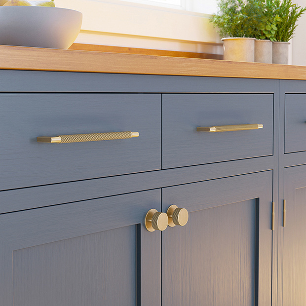 For example, it is ideally suited to combine with the ribbed round furniture knob in Vintage Gold.