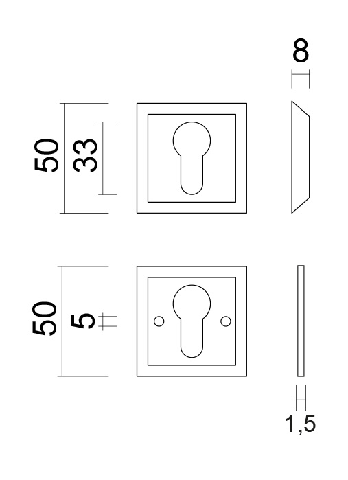 These black security cylinder plates square 50x50 mm. The outer rosette (A) is 8mm thick and the rosette on the inside has a thickness of 1.5mm.