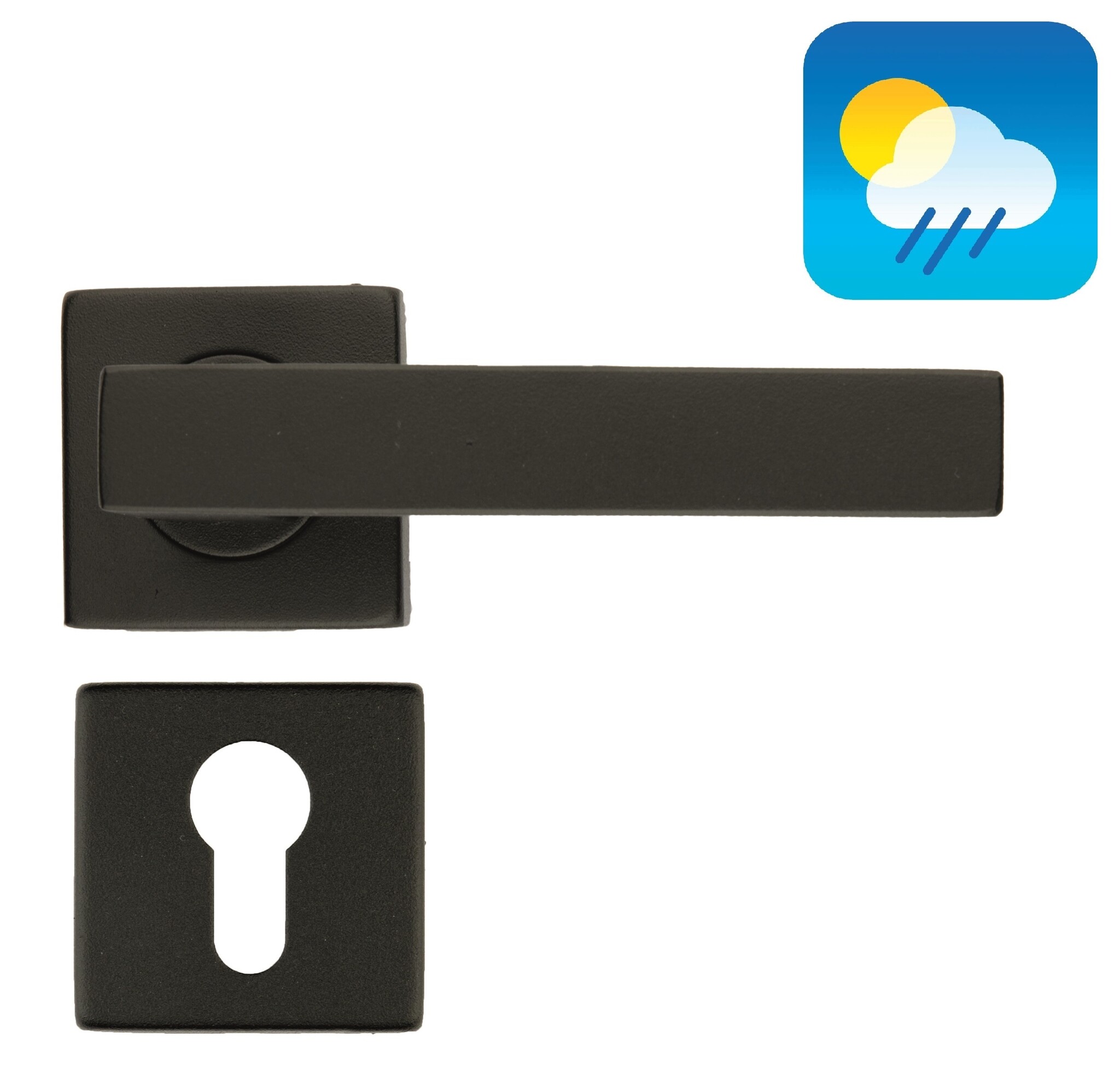 These black door handles are on square rosettes. They are made of stainless steel and finished with a matt black (Ral 9005) structure coating that is UV resistant, making these door handles also suitable for outdoor use .