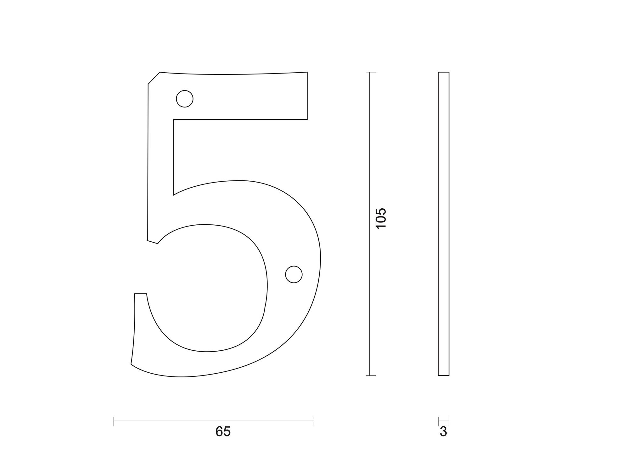 This black house number "5" is suitable for wall mounting, has a height of 105 mm and a thickness of 3 mm.
