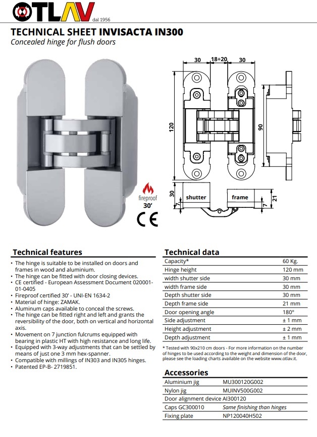 These 30x120mm 3D hinges are unique and patented , allowing you to mill them perfectly in the center thanks to their 30mm width. This means you can easily distinguish between left- and right-hand doors.