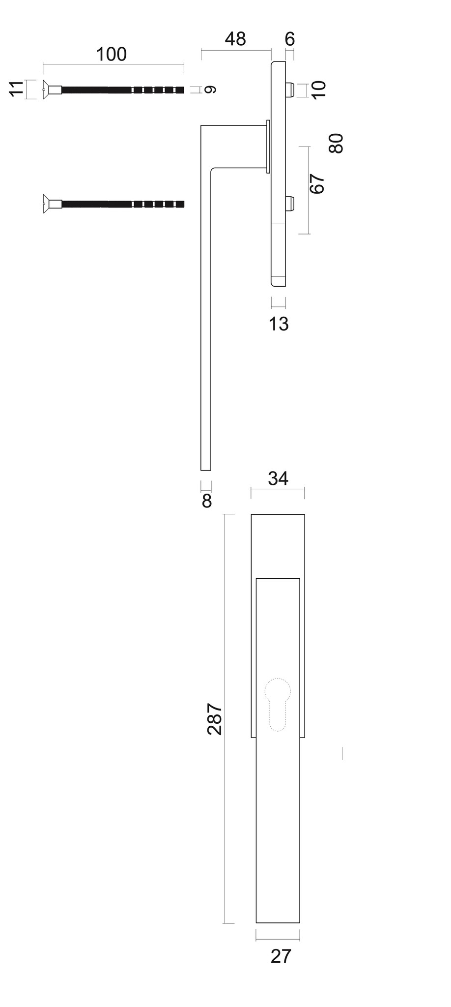 This lift/slide door system is specially designed for sliding doors. In both shields an opening is provided for a cylinder lock.