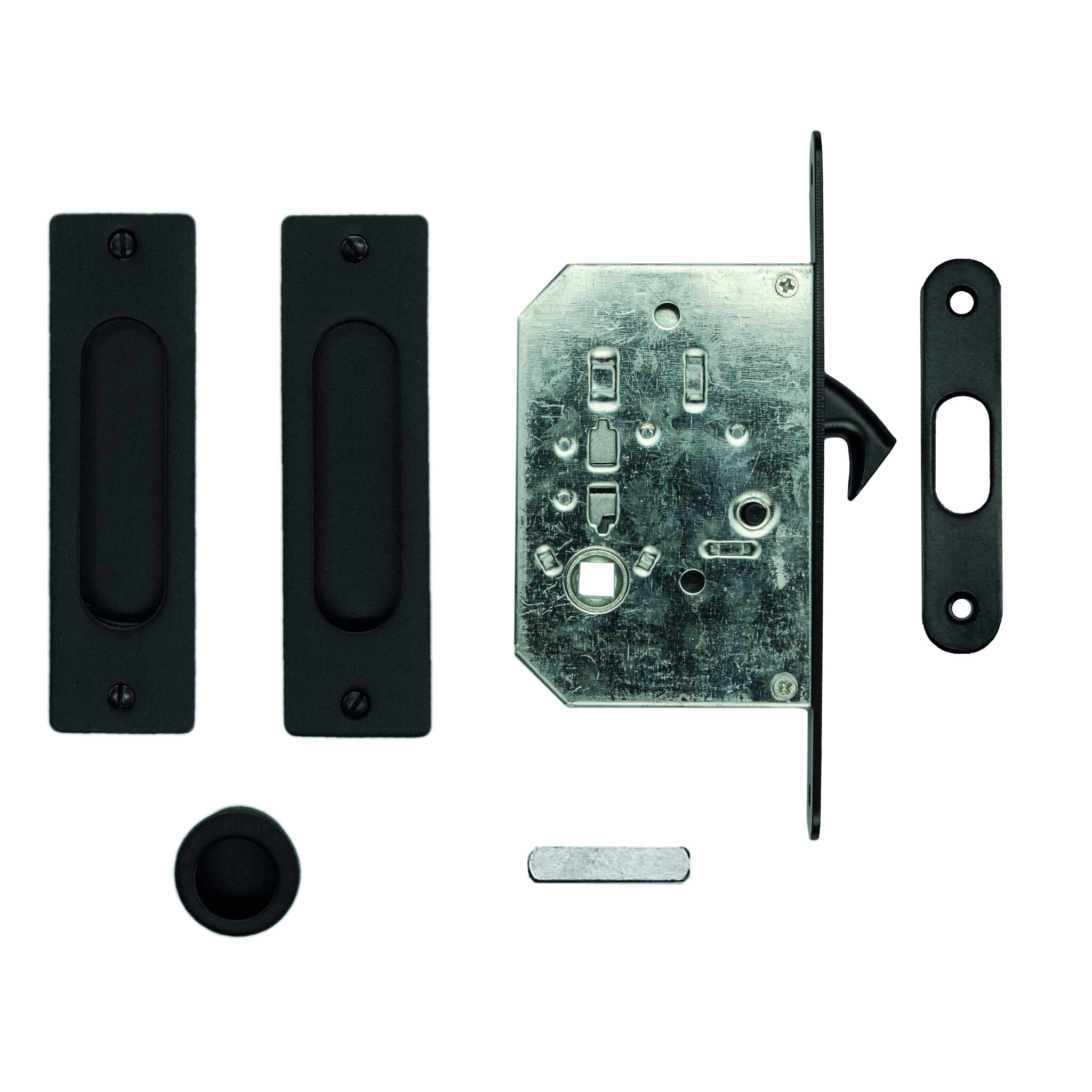 This black sliding door lock is supplied complete as a set including 8 small black screws of 15mm.