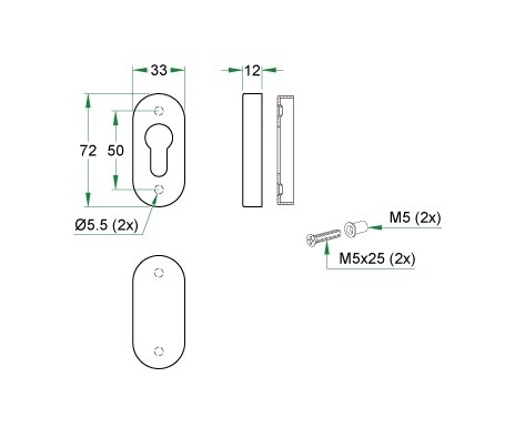 The blind oval rosette has the following dimensions: 72x33mm and has a thickness of 12mm. The screw holes are 50mm apart (vertically).