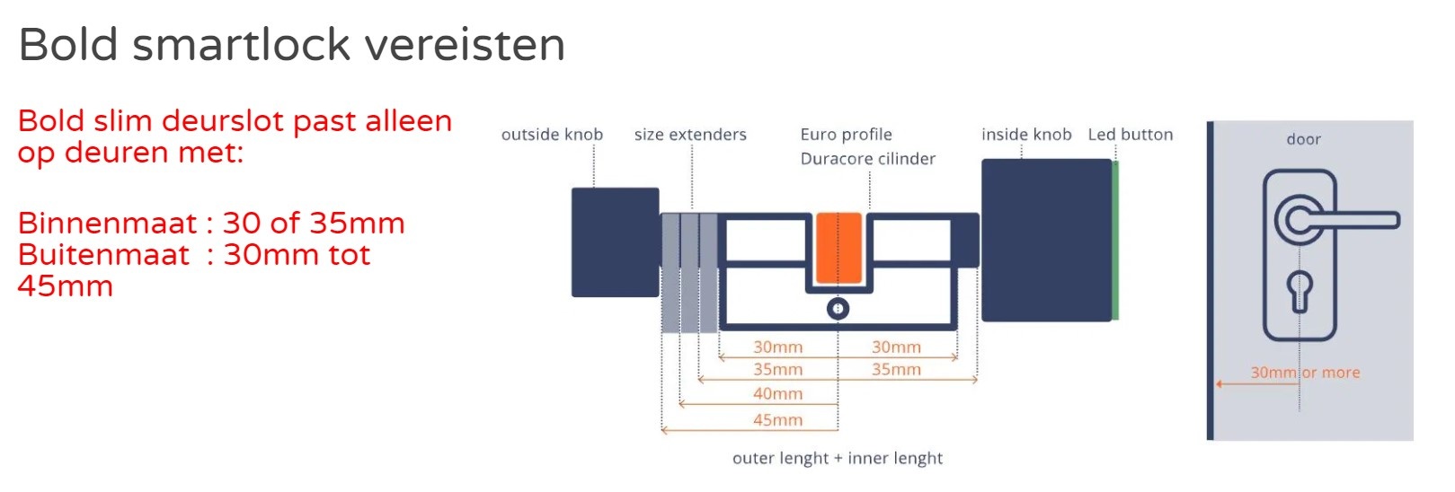 The Bold fits all doors with an inner size of up to 35 mm. The outer size can be extended to 45 mm with the supplied extension pieces.