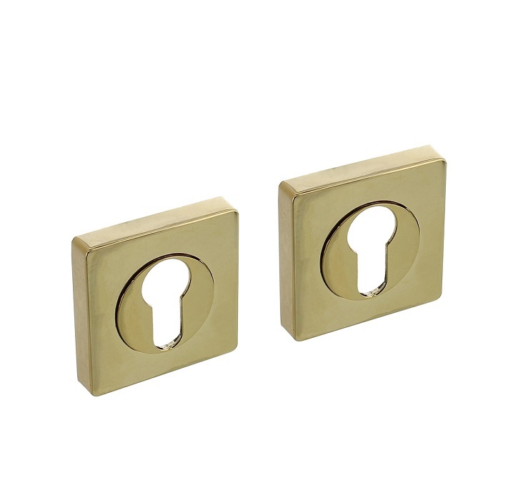 These concealed square rosettes with profile cylinder hole are made of zamak and measure 55x55x10 mm. Afterwards, the rosettes are provided with a high-quality brass-colored PVD coating, which gives a golden appearance.