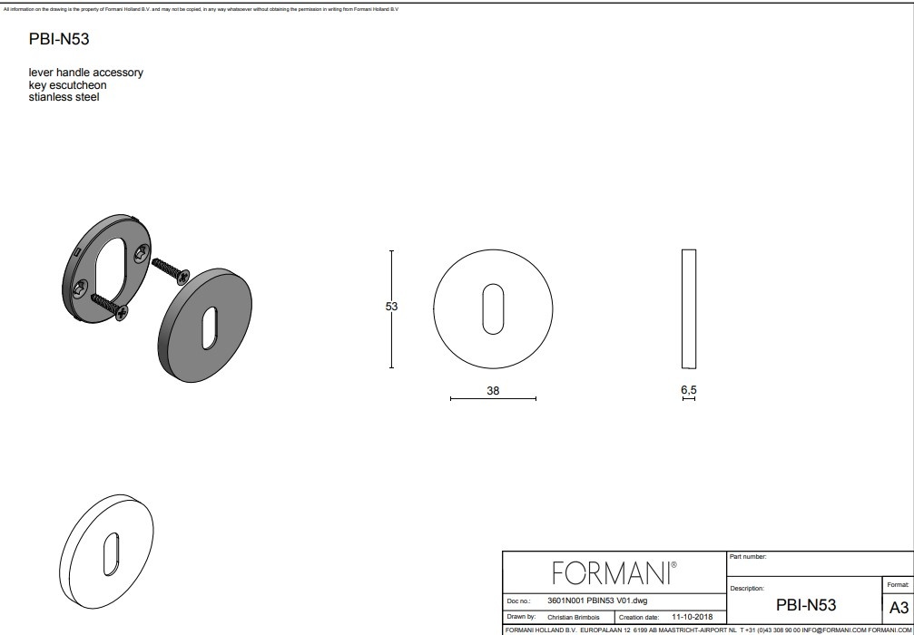 The key plate belongs to the Formani "INC" series and is made of stainless steel. The plate is finished with an extra-strong, light bronze PVD coating.