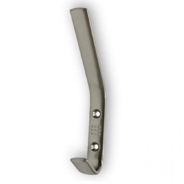 The zamac hook has a stainless steel end coating and two mounting holes in the vertical direction.