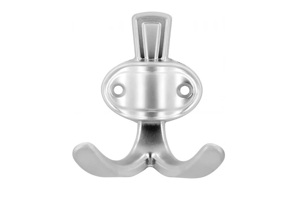 Coat hook made of zamac and then chrome-plated of 68 mm wide with two mounting holes horizontally