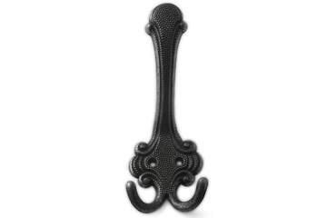 The zamac hook, finished with a black coating, has two mounting holes in the horizontal direction.