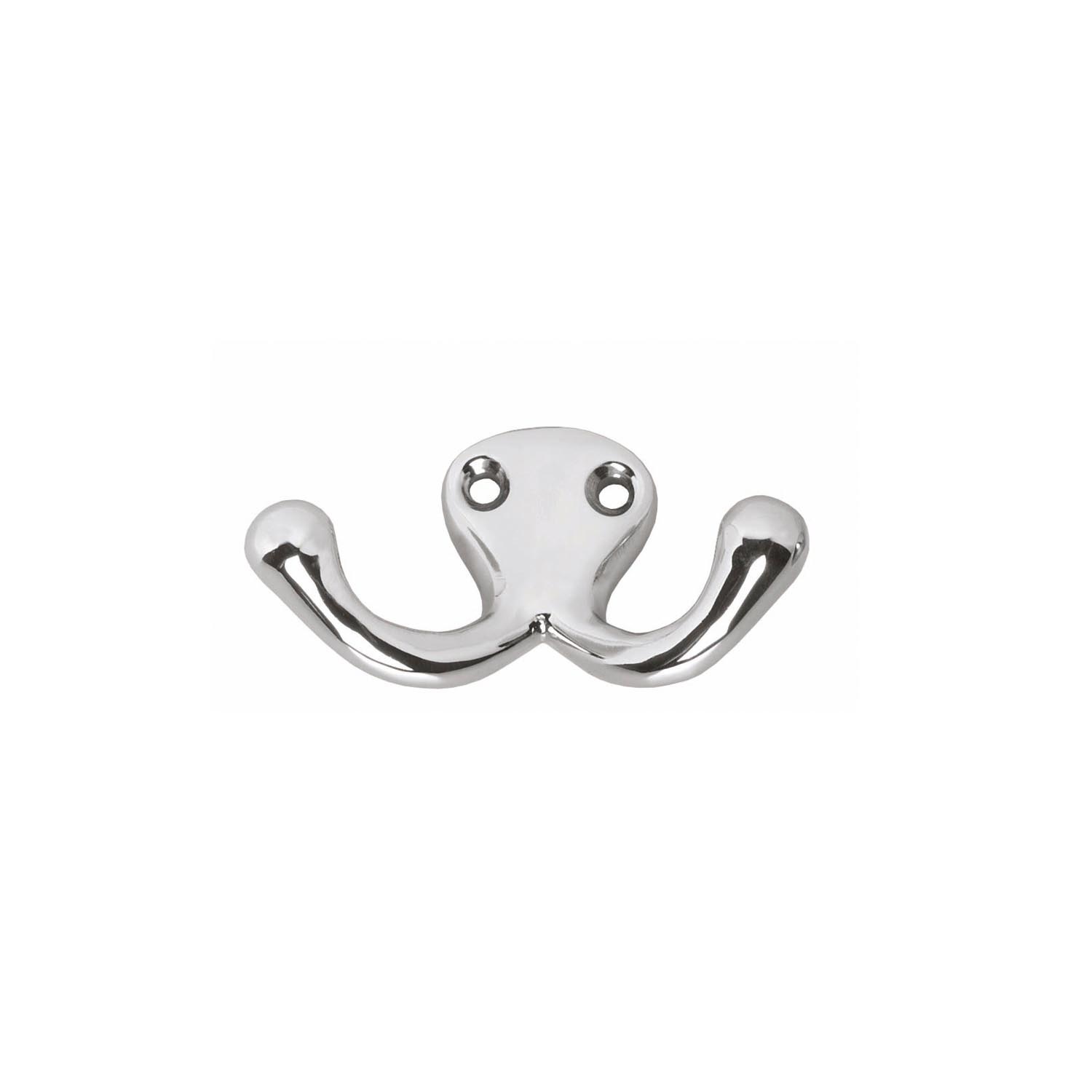 This ship model double hook has a length of 22 mm and a height of 34 mm and is finished in chrome and polished afterwards, giving it a shiny appearance. The total width is 70mm.