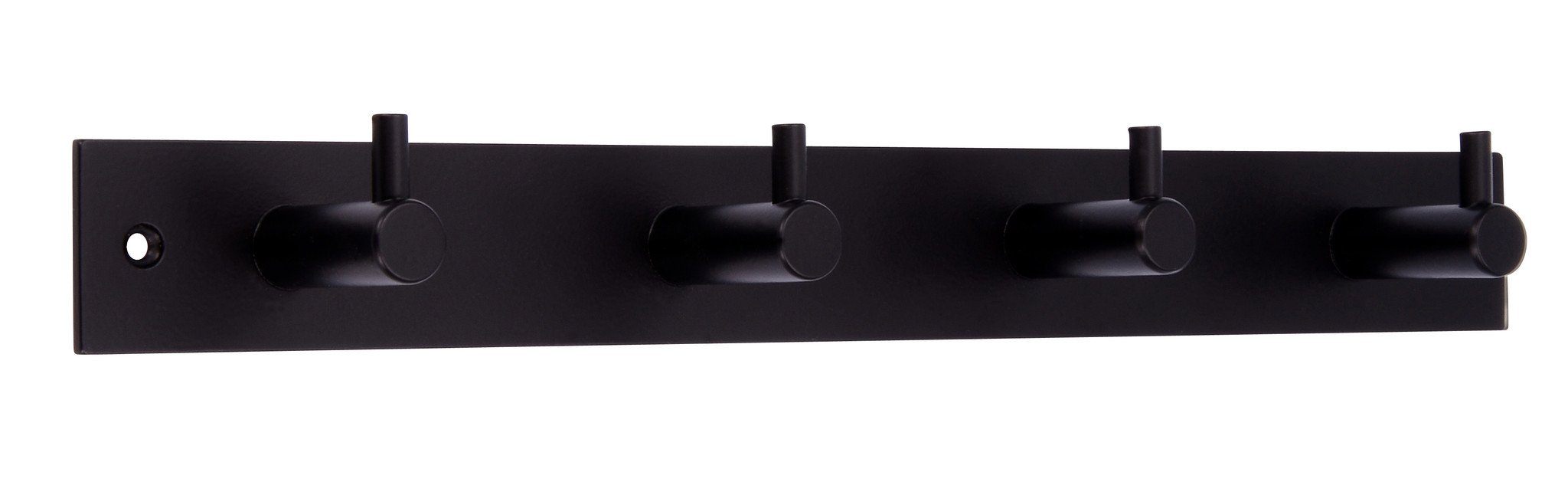 Description Modern steel coat rack with 4 hooks in black with a center distance of 298 mm