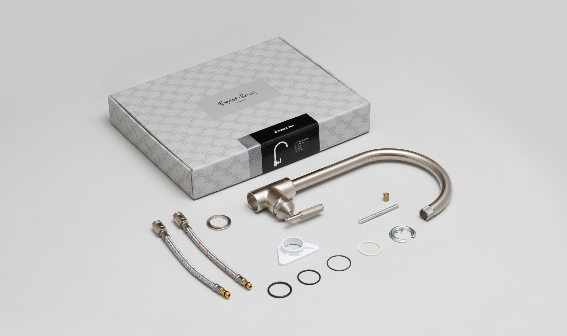 This brass mixer tap has a subtle acid-etched B+P logo and is supplied per piece with mounting.