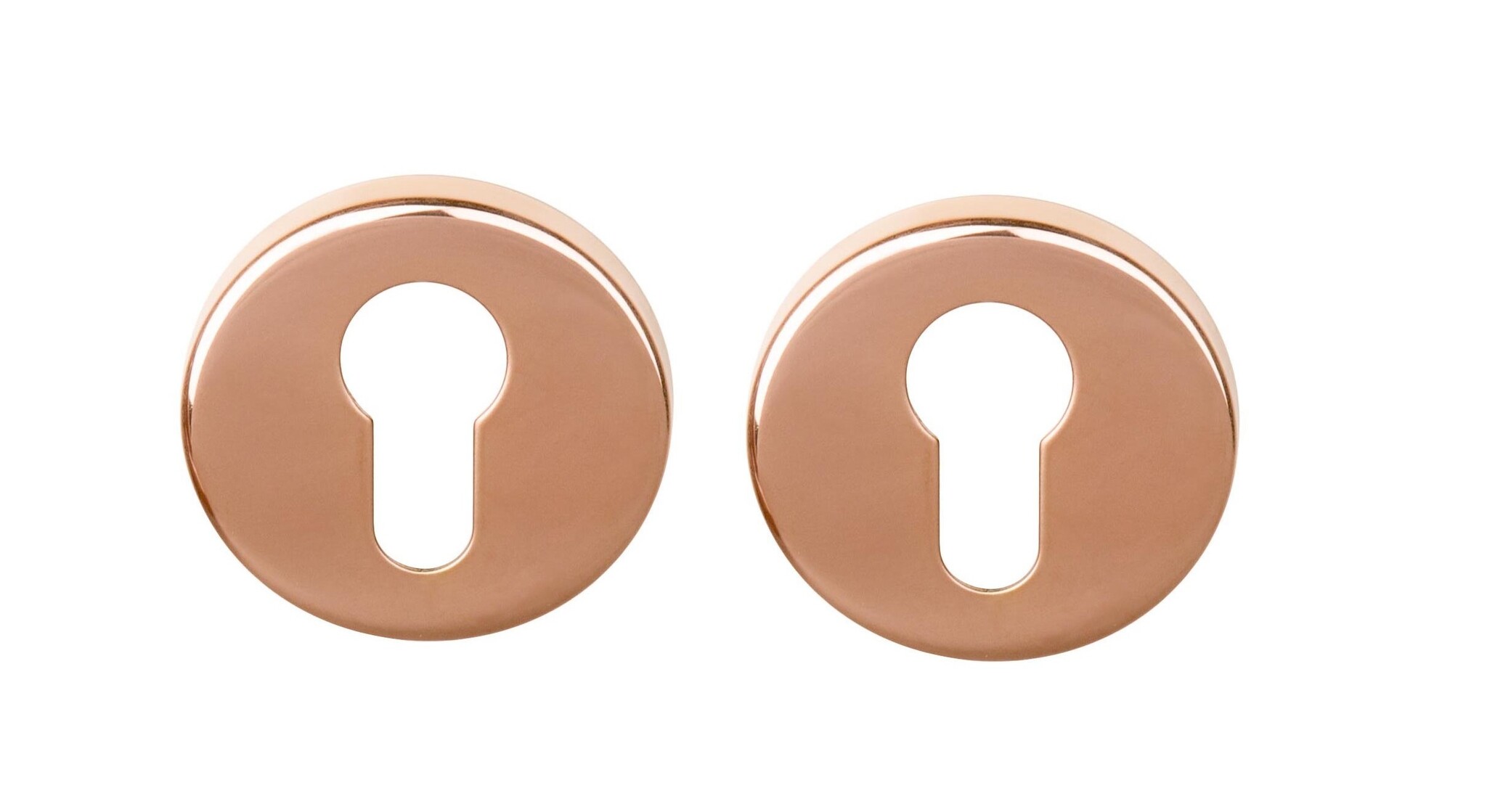 These LBY50 cylinder plates are supplied in pairs including a steel bottom rosette, finishing rosette in PVD polished copper and mounting material.