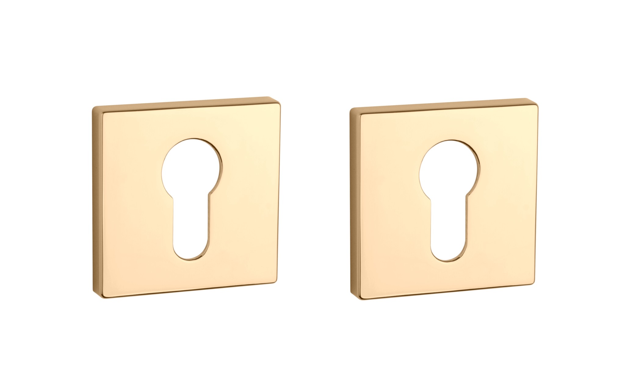 These gold-polished square profile cylinder rosettes measure 52x52 mm and are only 7 mm thick.